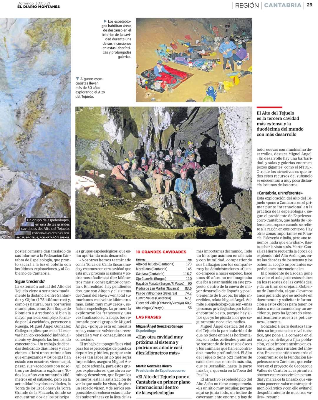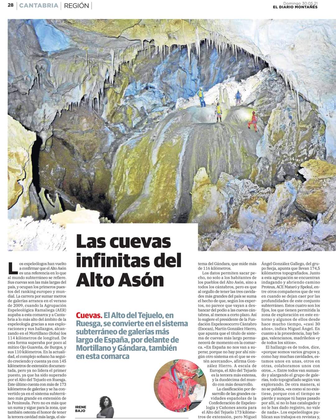 Compartimos el artículo publicado por el Diario Montañés del día 30 de mayo de 2021, donde dedican dos páginas al Alto del Tejuelo y al hecho de ser el Sistema más grande de España con más de 170km de desarrollo. ¡¡Espeleología con Mayúsculas!! Son pocas veces las que los medios de comunicación sacan en sus líneas algo sobre espeleología que no esté relacionado con accidentes y rescates, así que es para estar orgullosos. Aunque en este caso se centran en los grandes sistemas que tenemos en Cantabria, destacando la joya de la corono, Alto del Tejuelo, hay que hacer extensivo este éxito a todos los trabajos de exploración que se realizan en nuestra comunidad autónoma, que sin duda es un referente en el resto de España y fuera de nuestras fronteras. El trabajo silencioso y altruista de quienes no salen nunca en la foto ni se les pone nombre. ¡¡¡Enhorabuena!!!