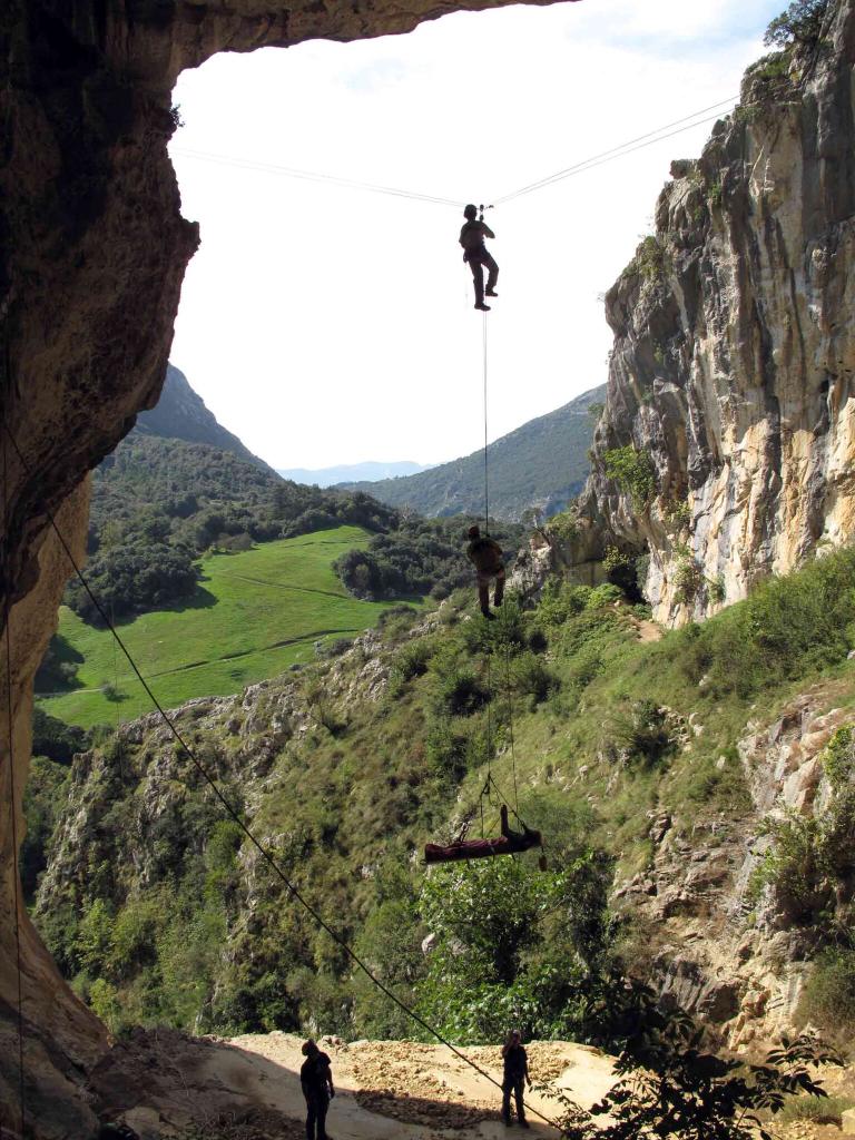 El primer día en la boca de Cuevamur con un tiempo perfecto se utilizaron todos los distintos sistemas de anclaje, tirolinas y progresión de camilla que se practicarían el domingo dentro de la cavidad. Las técnicas adoptadas heredadas del sistema francés facilitan el movimiento y la seguridad de la camilla, siendo indispensable seguir los consejos y las directrices de los coordinadores para hacer una buena labor de equipo.